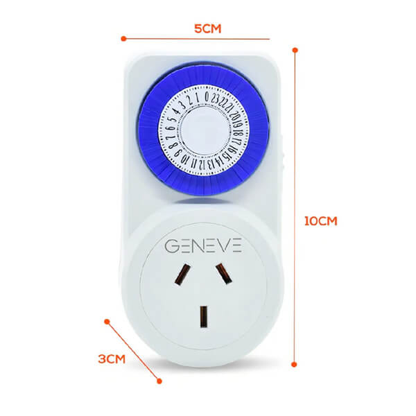 Timer temporizador mecánico analógico programable enchufable. Ideal para programación de equipos con frecuencia de funcionamiento preestablecido. Encendido/apagado de luces exteriores, interiores, sistema de calefacción, refrigeración, iluminación de vidrieras, etc. Uso residencial, comercial, industrial. Programación mínima 15 minutos. Programación máxima 24hs. Consumo máximo 2200W.